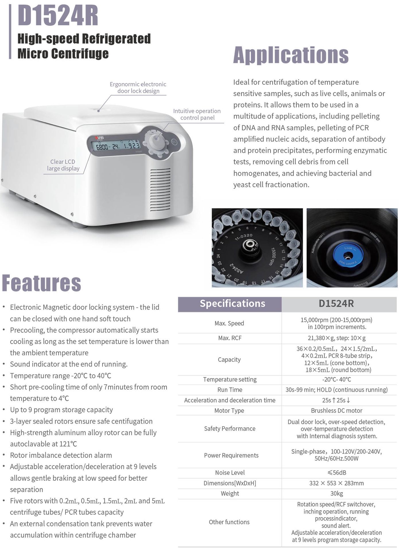 - Mendukung lima jenis rotor untuk tabung sentrifugasi/ tabung PCR ukuran 0,2mL, 0,5mL, 1,5mL, 2mL, dan 5mL.